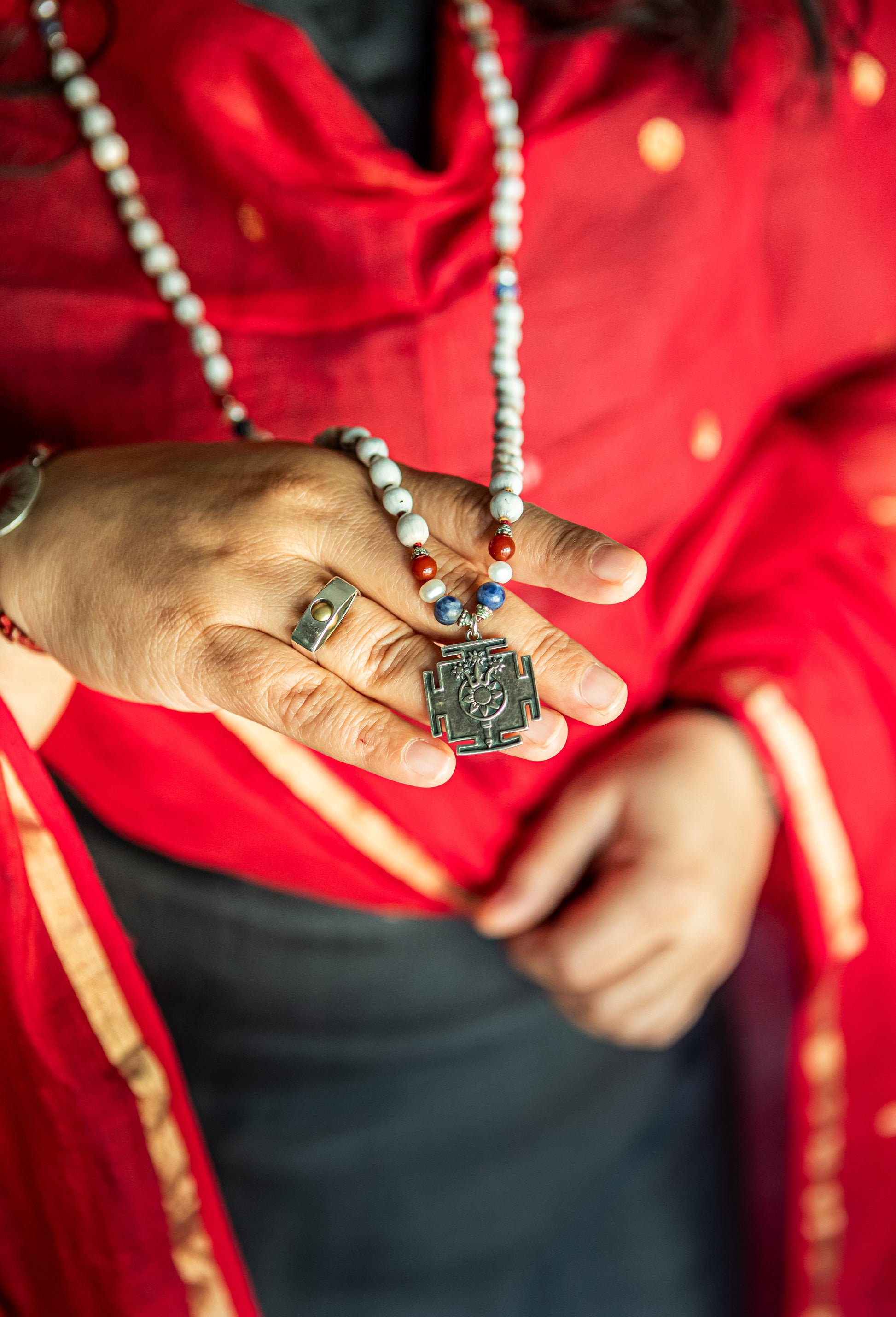 The sterling silver pendant is the crown jewel of the mala representing Shakti. On one side is the hand-scribed “Shri” by Indu, on the other side is the Trishulabja Mandala of Para Devi