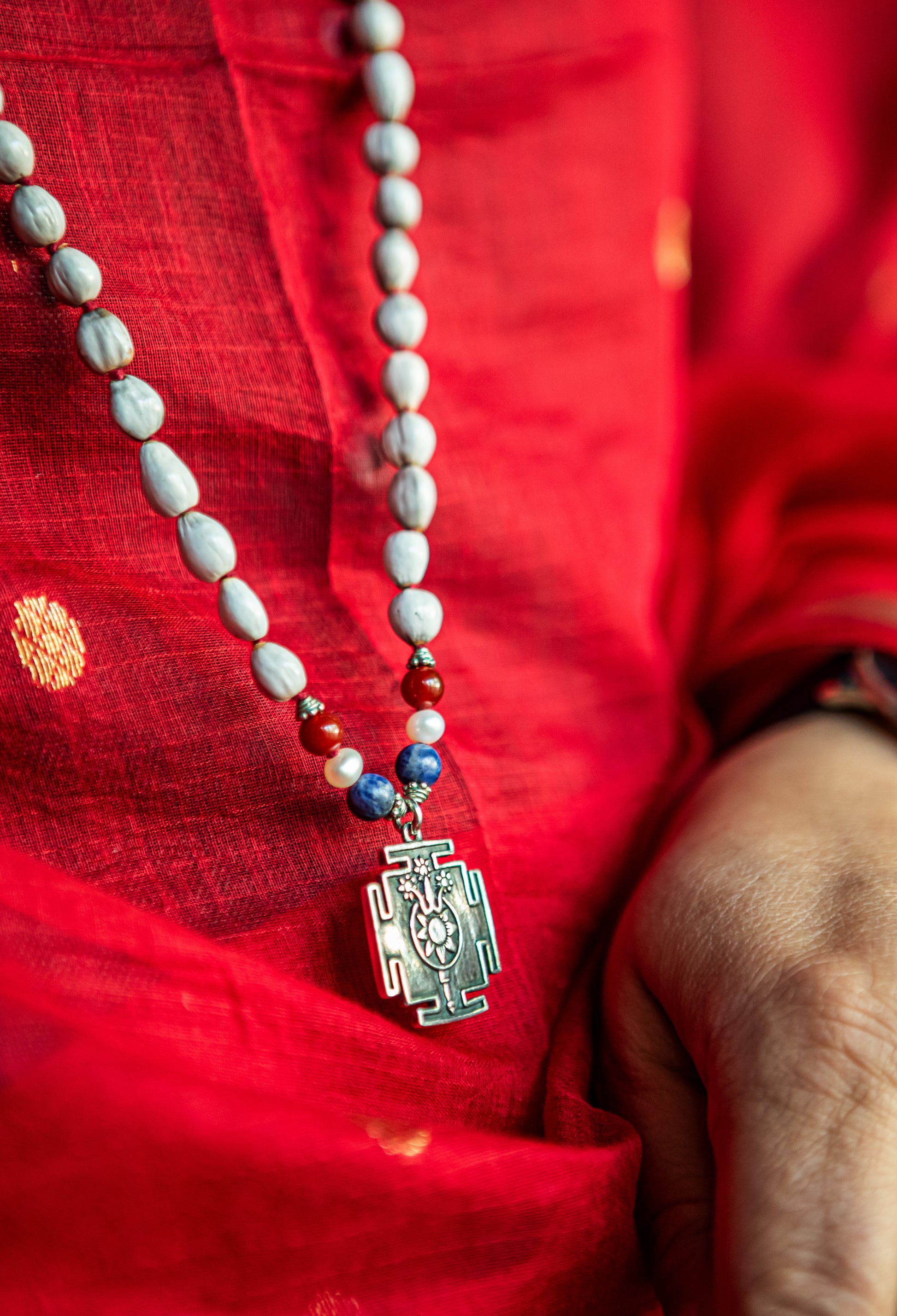 Gemstones: Sodalite, Carnelian, Fresh water pearls, Vaijyanti beads